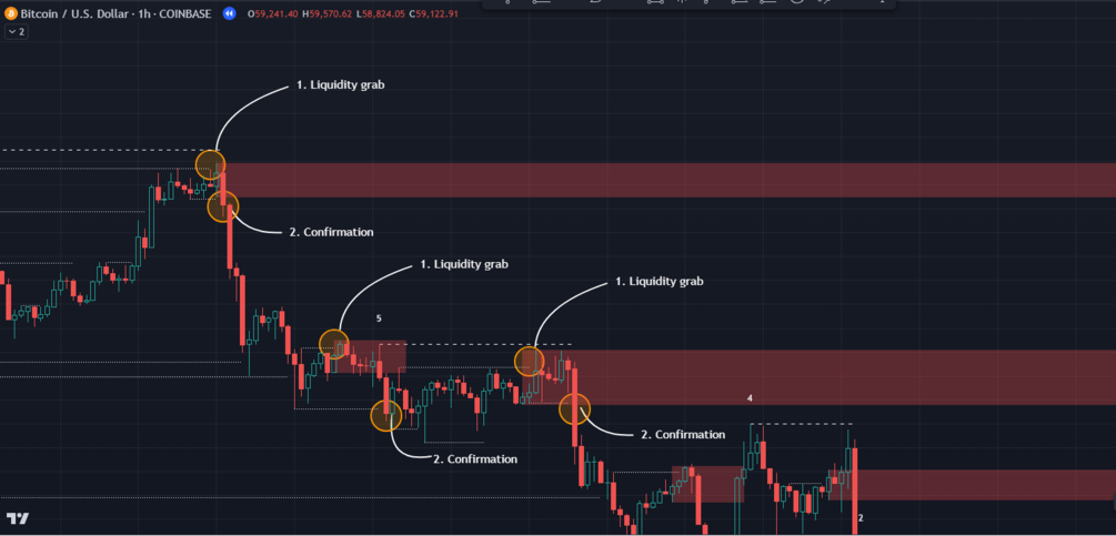 - 4. The grab is confirmed, when the liquidity in that oppsiite direction is grabed, or simply when the bearish market trend resumes by breaking the lows, along with additional confirmations